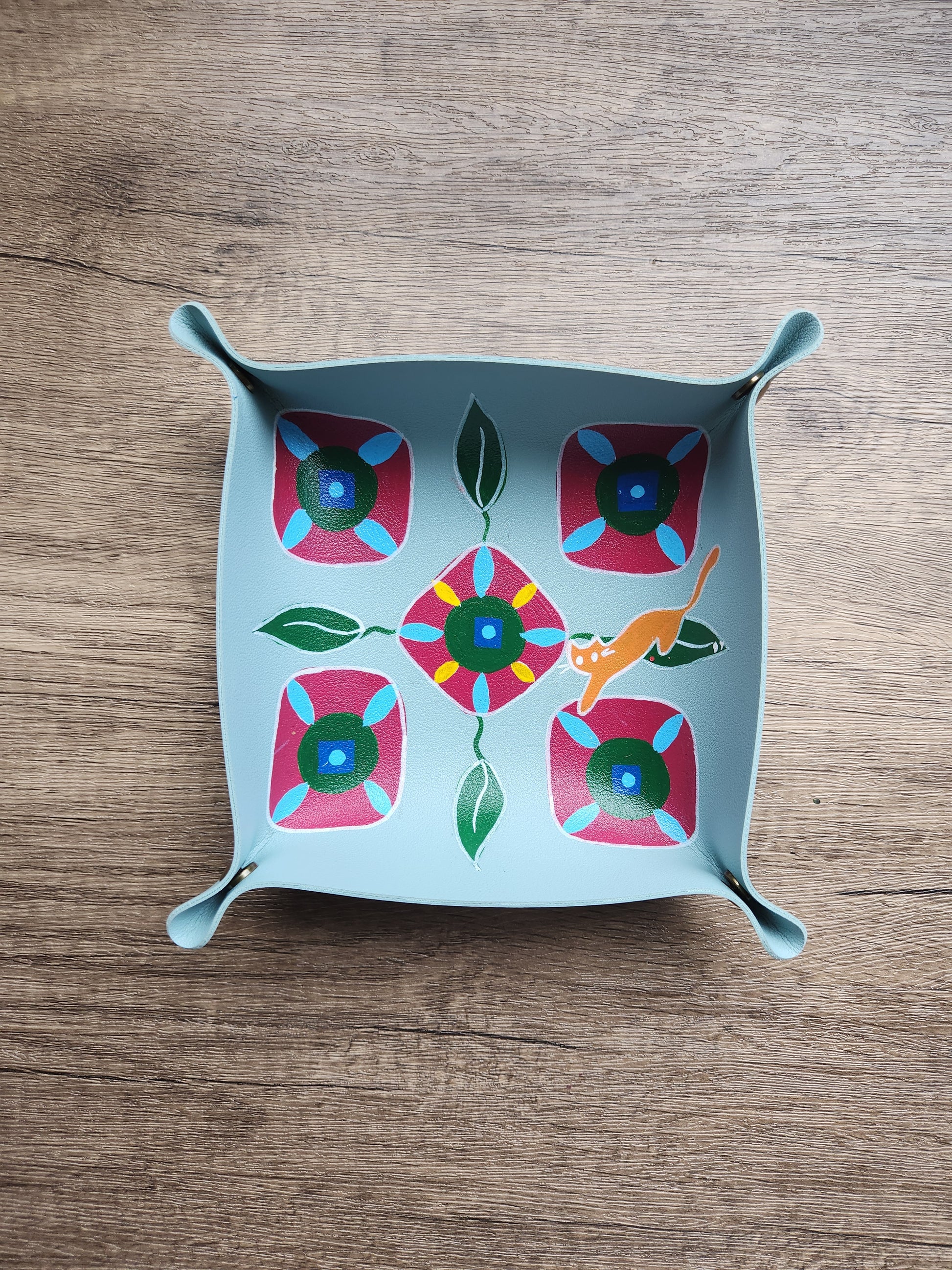 This pastel blue collapsible trinket tray is handmade using vegan-friendly material and designed looking like a Peranakan tile. It features an orange cat playing, celebrating our fun local community cats.