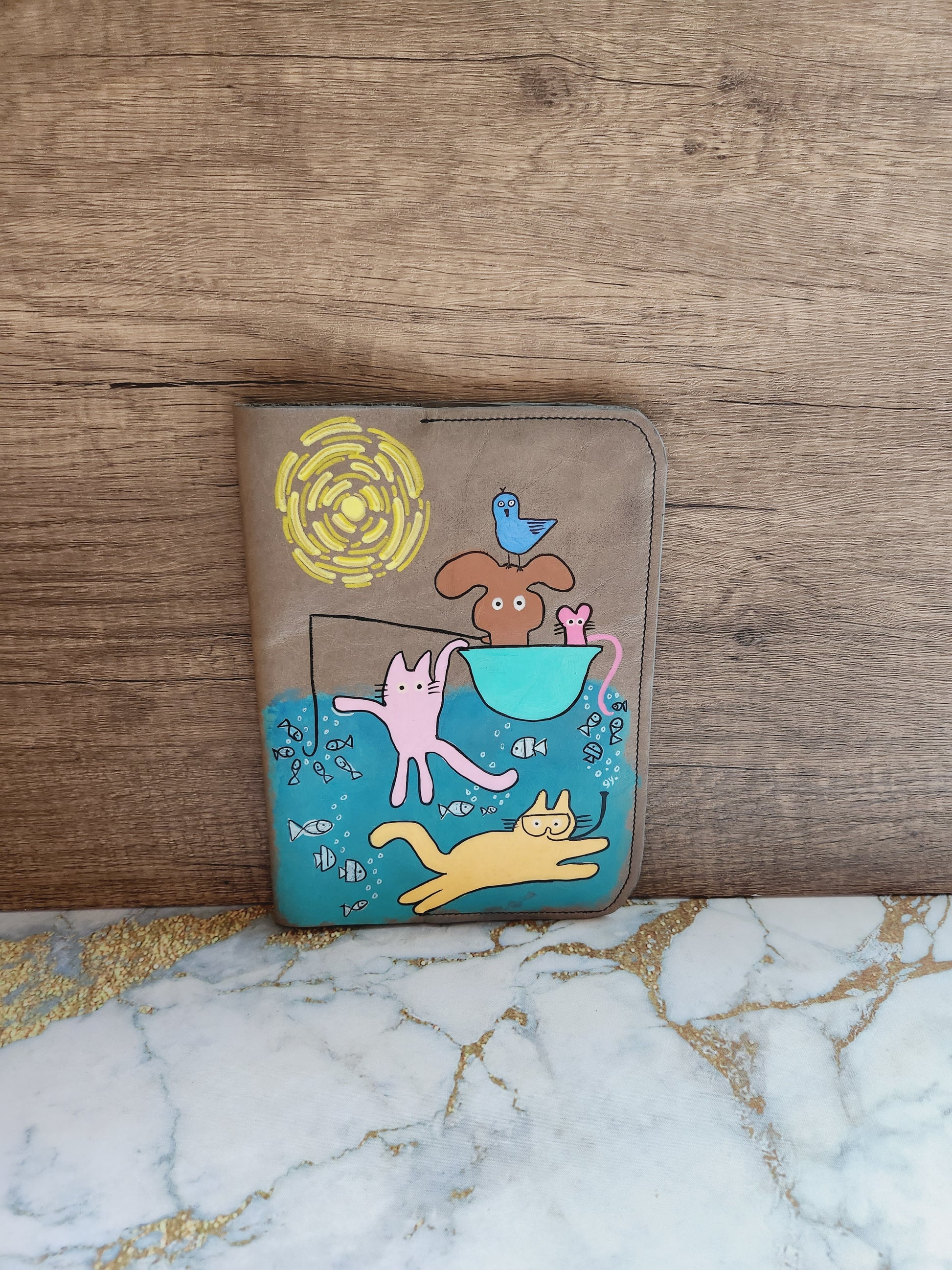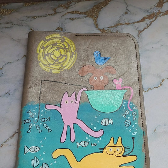 Painted and finished using Angelus leather products, this gray notebook cover features animals having fun nautically and fits any A5 notebooks; you can use it over and over again by just switching out the notebook inside!
