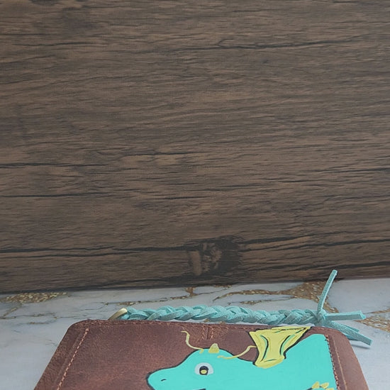 Carry a dragon with you everyday! This handmade pouch featuring a painted green dragon is the perfect holder for your cards and cash! Made from beautiful veg-tanned leather, it ages with you and remains stress free and stylish.