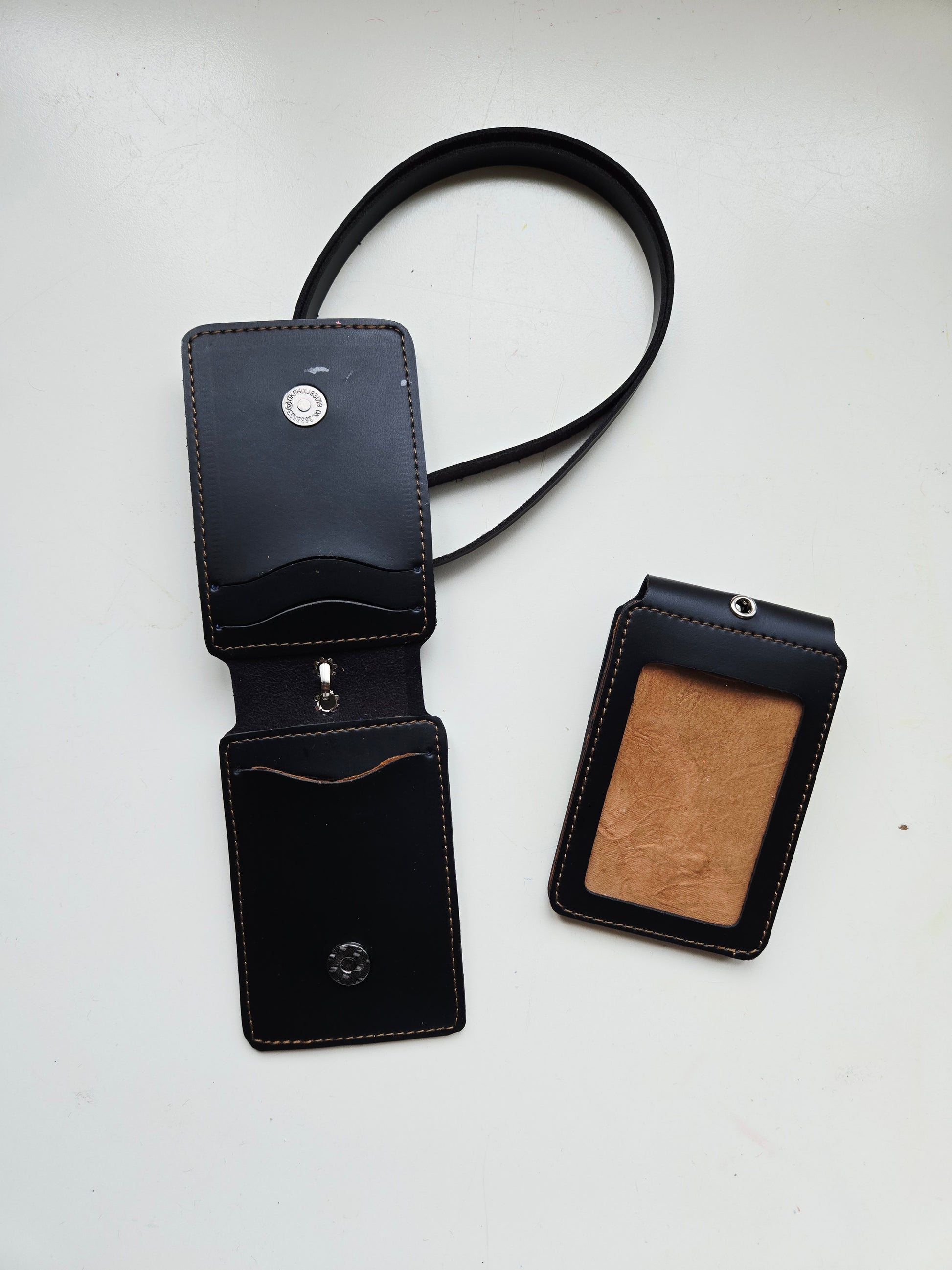 Hand crafted and painted, this Black card holder can be used as a lanyard, or a bag/luggage tag. It is made from chrome tanned leather and is practically scratch resistant!