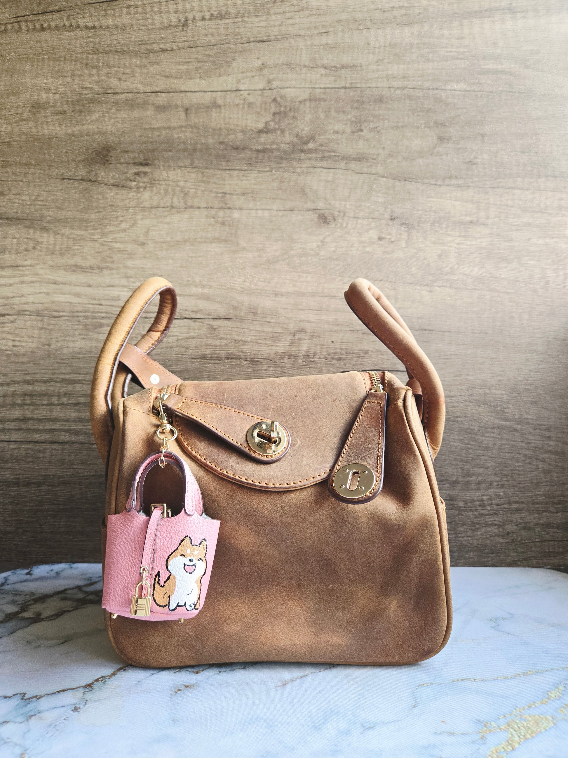 A Bag on a Bag?! Painted Shiba Inu doggy bag charm, in Pink Sakura. Perfect as a crystal amulet bag. Can be used as a necklace too.